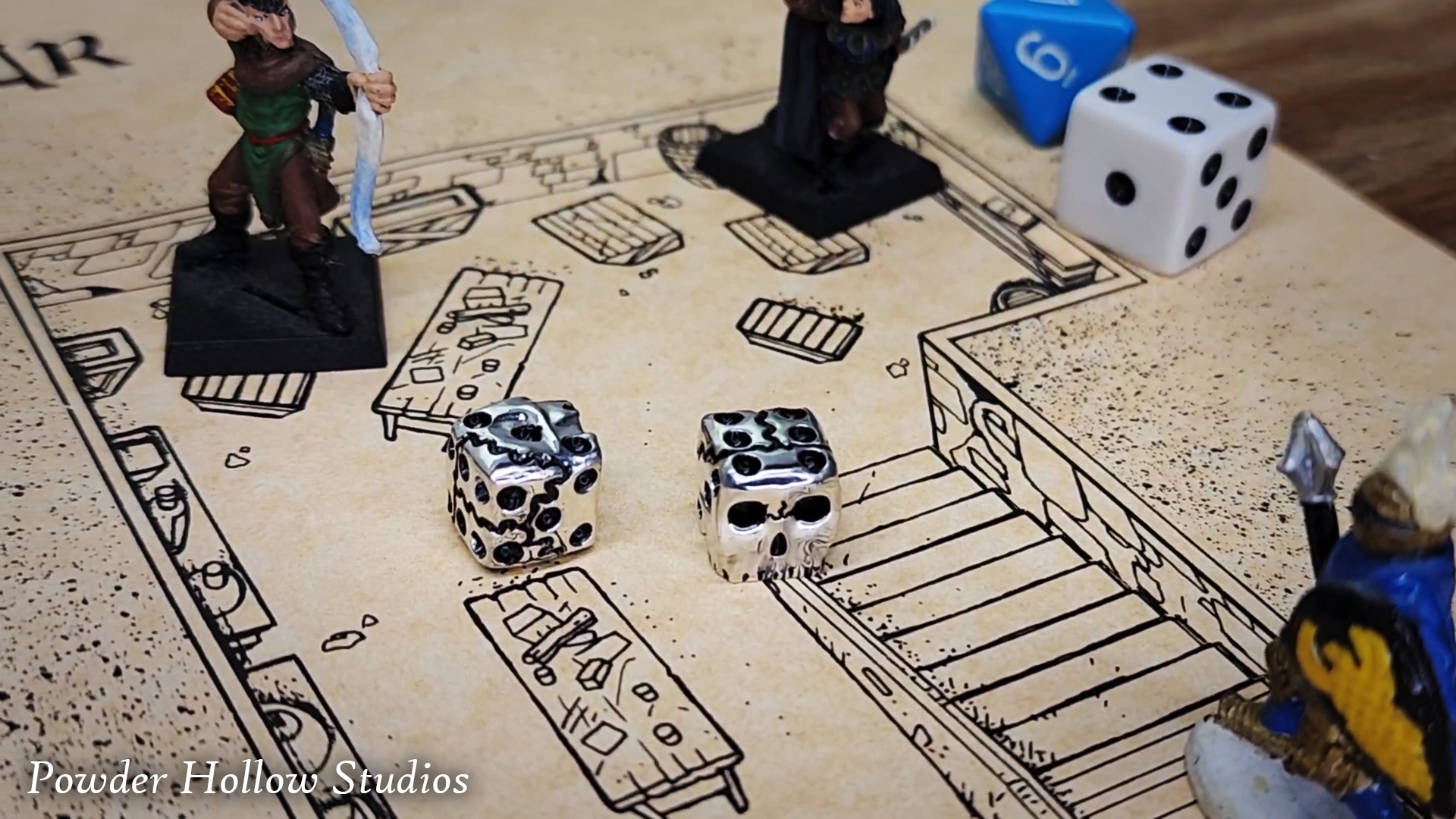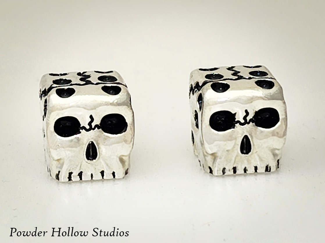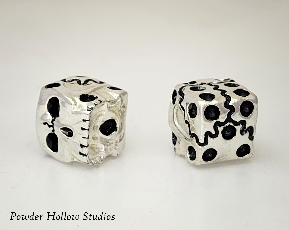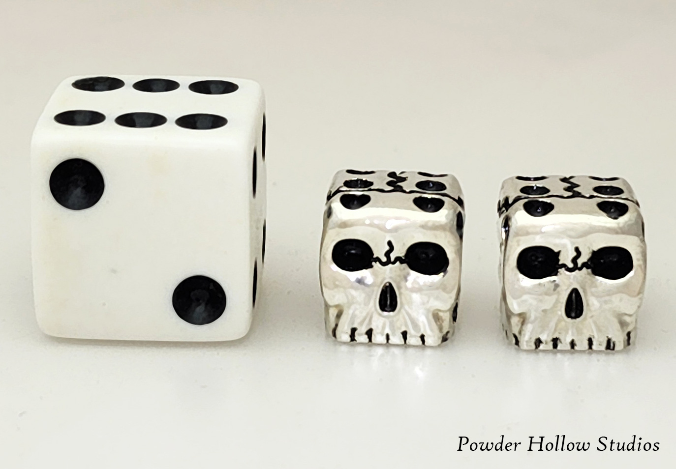 They are hand made in solid 925 sterling silver and measure approximately 1 cm square, roughly half the size of a standard D6. They are not weighted to favor any side and roll normally.