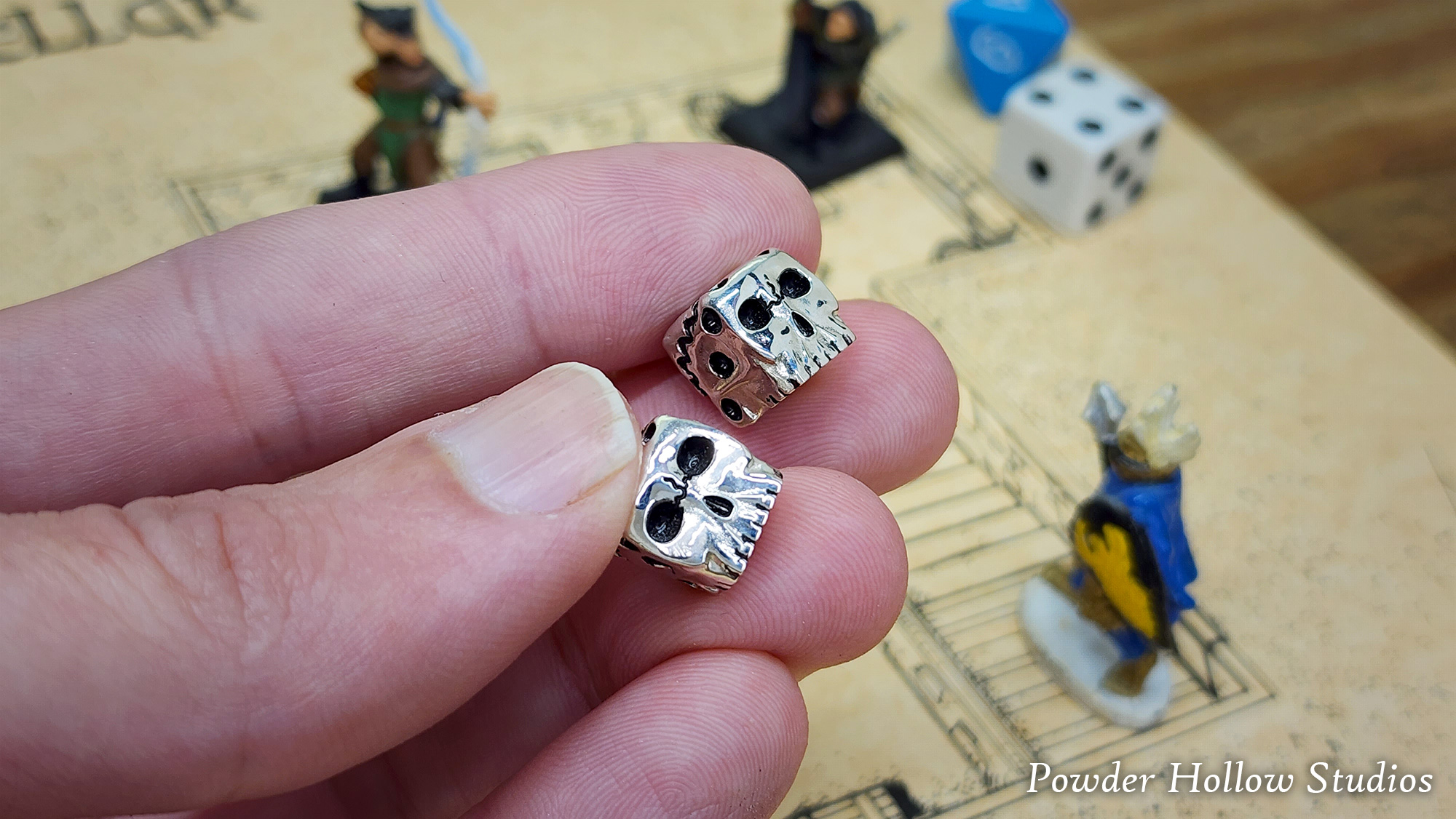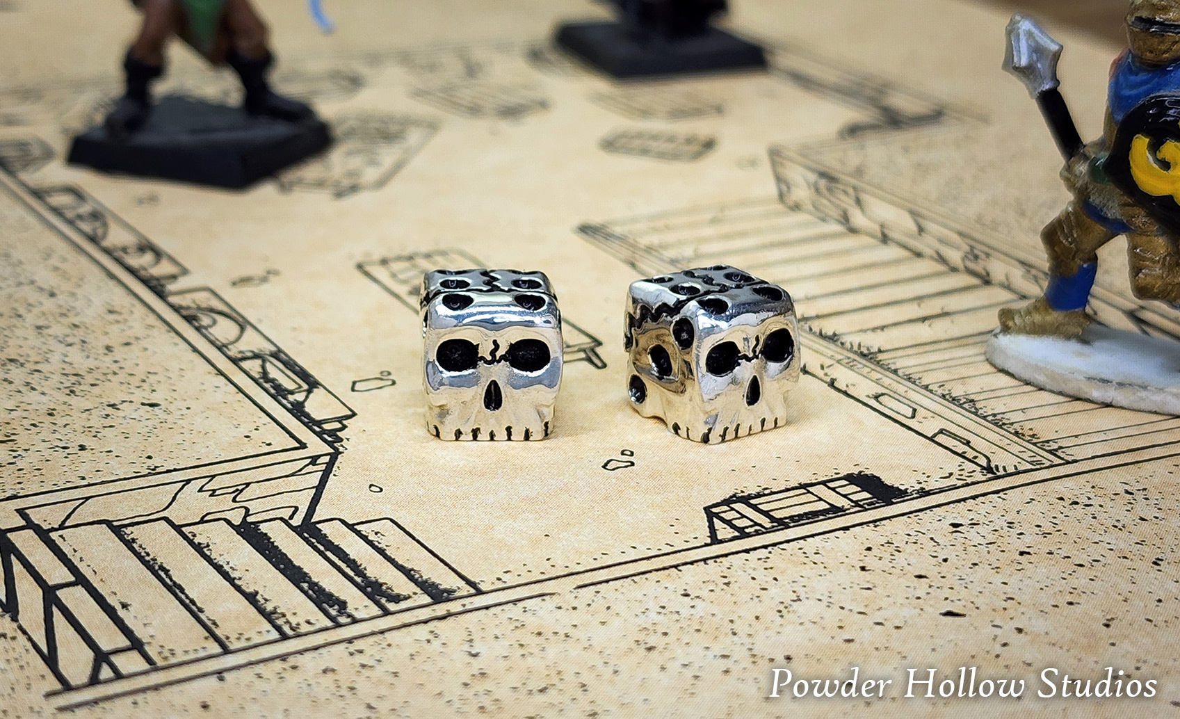 Roll dem bones! These mini 6 sided dice are in the shape of a human skull! Perfect for that two handed great sword of yours or just to show off, these dice are a great gift idea for any gamer geek, board game enthusiast, or fan of skulls, bones and skeletons.