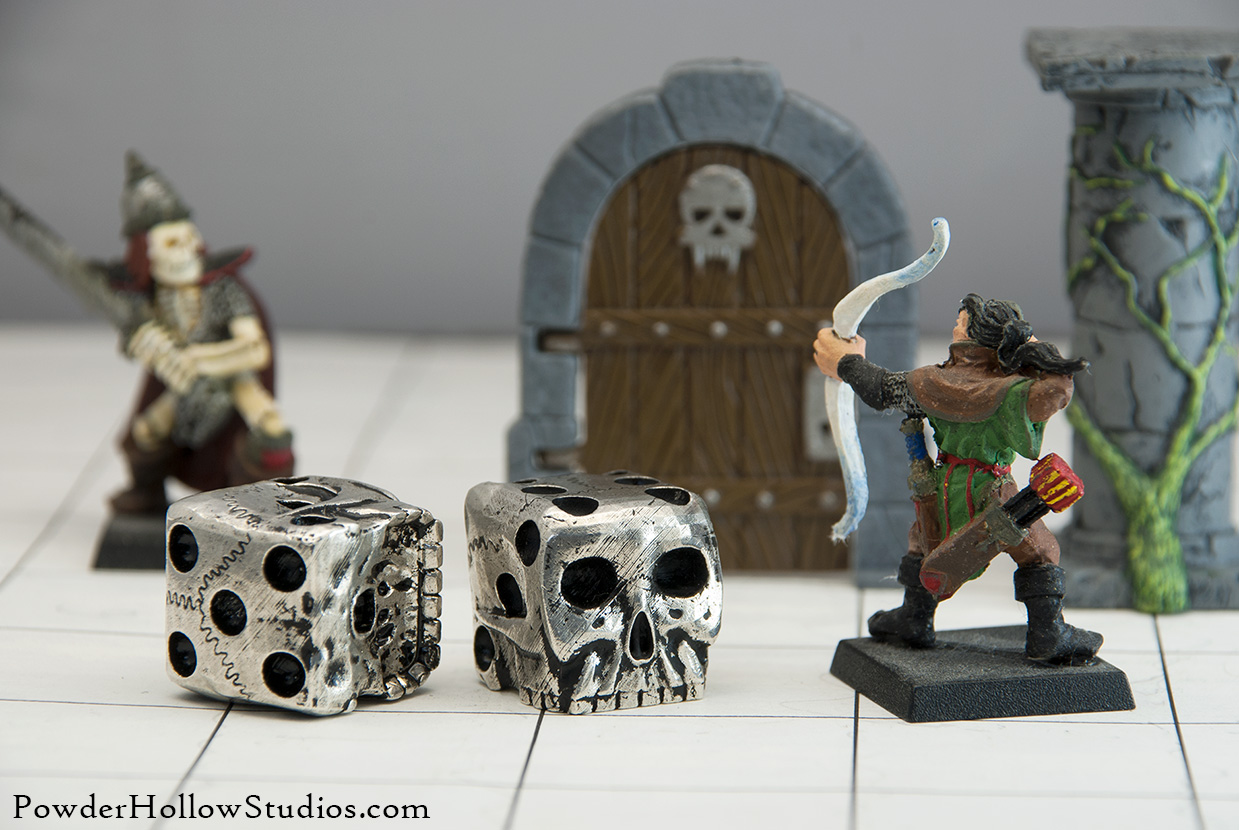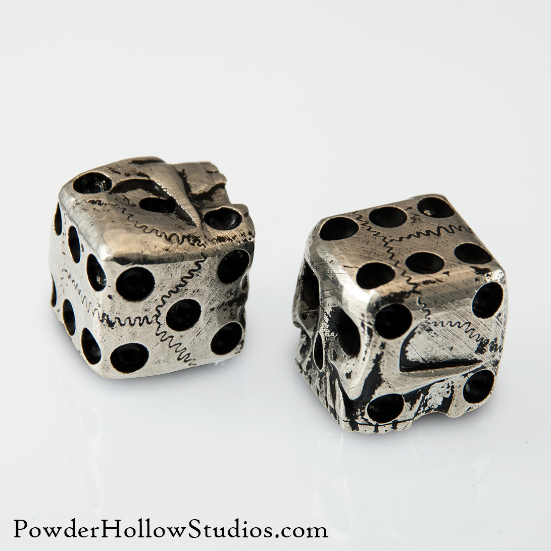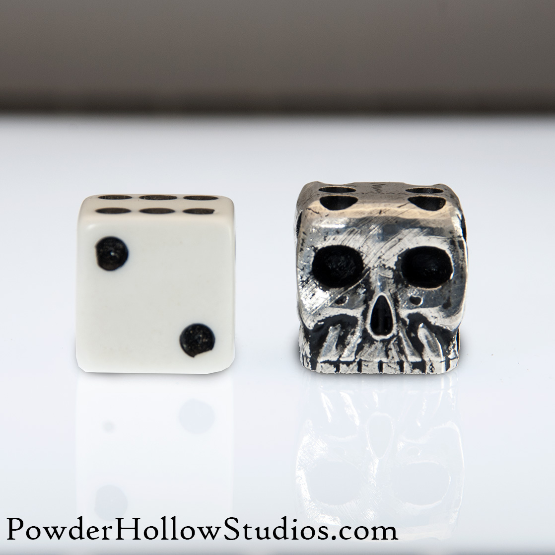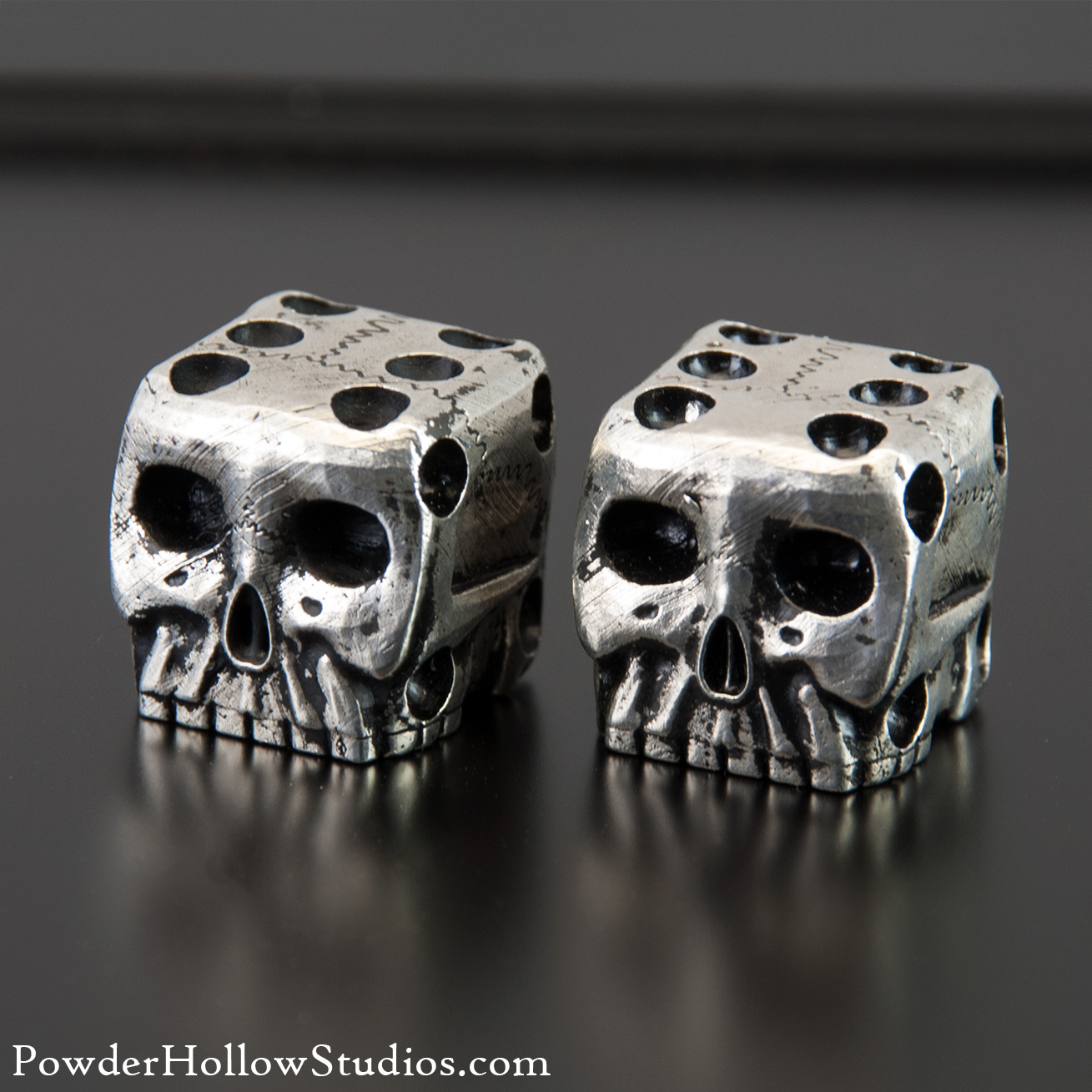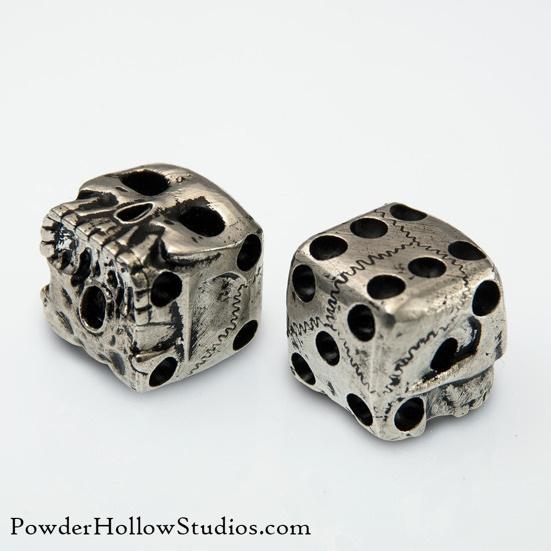 Hand cast and finished with a dark antiqued patina, each die gleams with a sinister luster, evoking the timeless aura of forbidden treasures. Made from solid sterling silver, they have a weighty, satisfying feel in the hand—balanced enough to roll true, and menacing enough to make every toss count. Whether you're facing off at the gaming table or displaying them as a bold statement, these dice are relics of power, forged for those who roll with death.